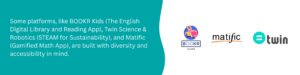 Some platforms, like BOOKR Kids (The English Digital Library and Reading App), Twin Science & Robotics (STEAM for Sustainability), and Matific (Gamified Math App), are built with diversity and accessibility in mind. Whether learners are neurodiverse, multilingual, or in underserved communities, our tools adapt to their needs, ensuring no one is left behind.