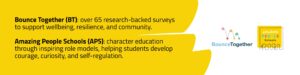 - Bounce Together (BT): over 65 research-backed surveys to support wellbeing, resilience, and community.