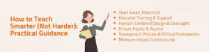 In the end, “teaching smarter, not harder” means making choices: choosing tools that align with local needs and values; choosing to preserve human agency, ethics, and equity; choosing to invest in training, policy, and infrastructure as much as in the tech itself.