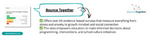 Our wellbeing assessment tools provide schools with comprehensive data about these crucial outcomes. Bounce Together offers over 65 evidence-based surveys that measure everything from stress and anxiety to growth mindset and social connection. This data empowers educators to make informed decisions about programming, interventions, and school culture initiatives.